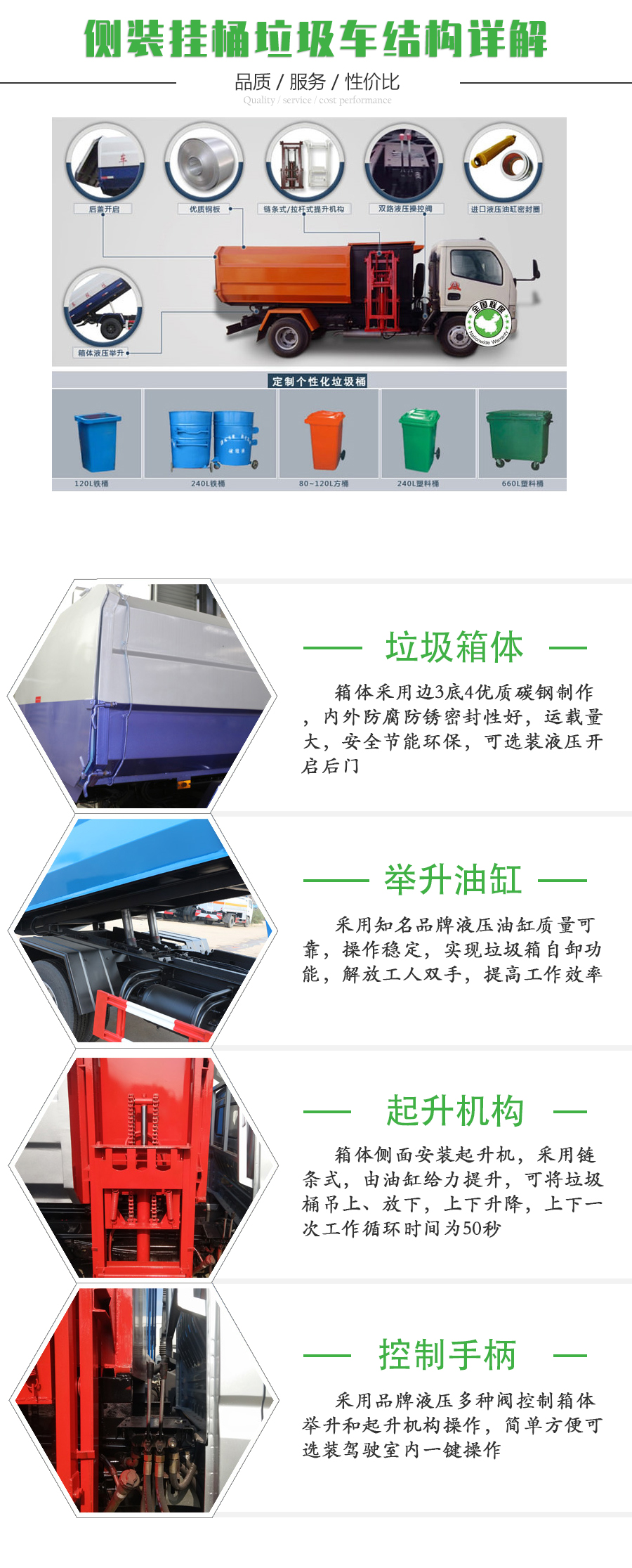 特點 | 通過副駕一側的提升機,將240L塑料垃圾桶垃圾提升至垃圾收集口,實現對垃圾的裝載及卸料作業功能; | |